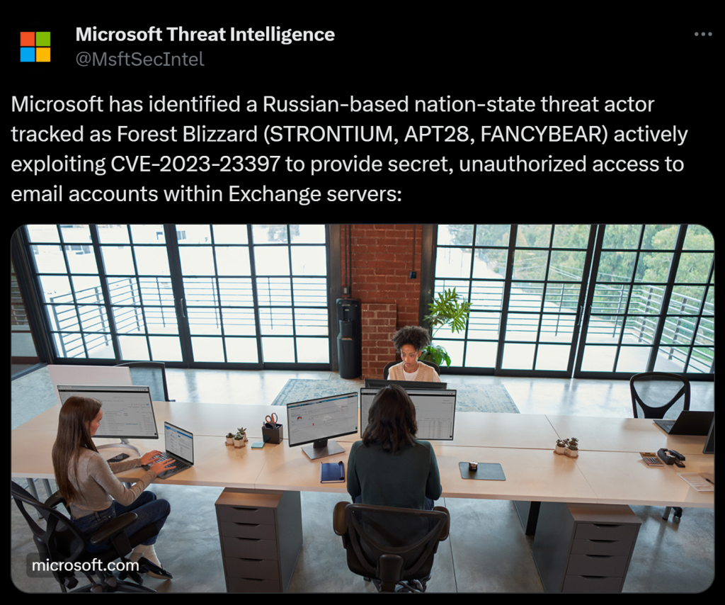 Microsoft’s Threat Intelligence team issued a warning earlier today about the Russian state-sponsored actor APT28 (aka “Fancybear” or “Strontium”) actively exploiting the CVE-2023-23397 Outlook flaw to hijack Microsoft Exchange accounts and steal sensitive information.
